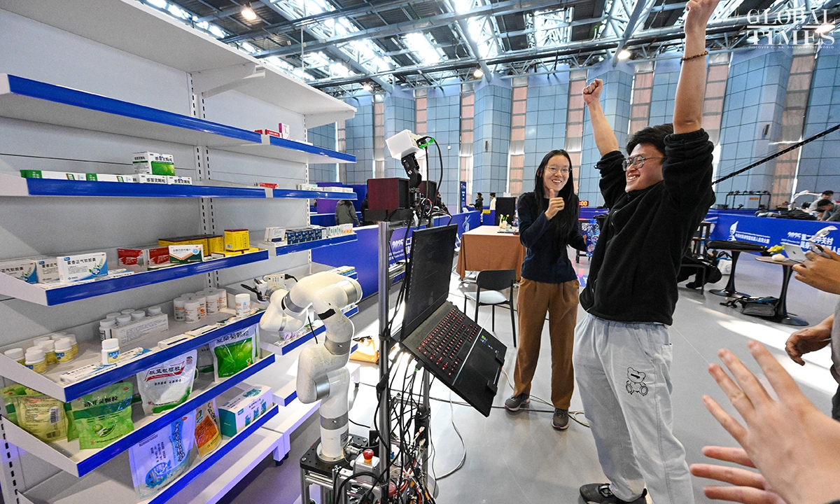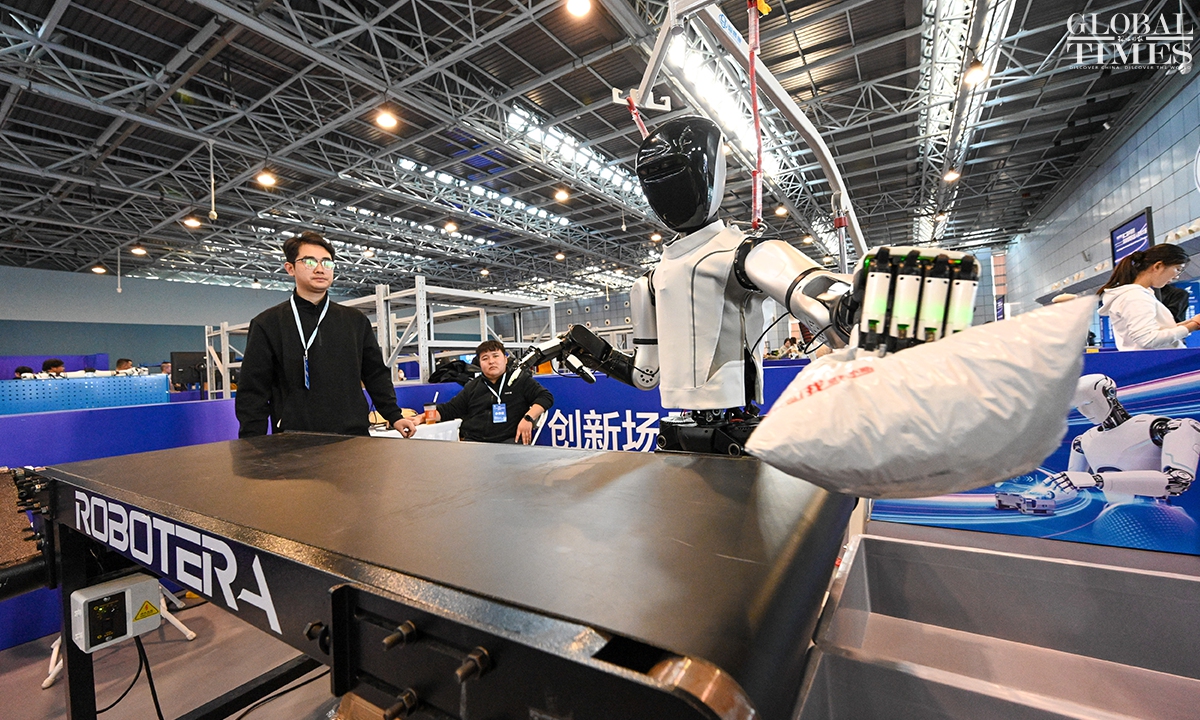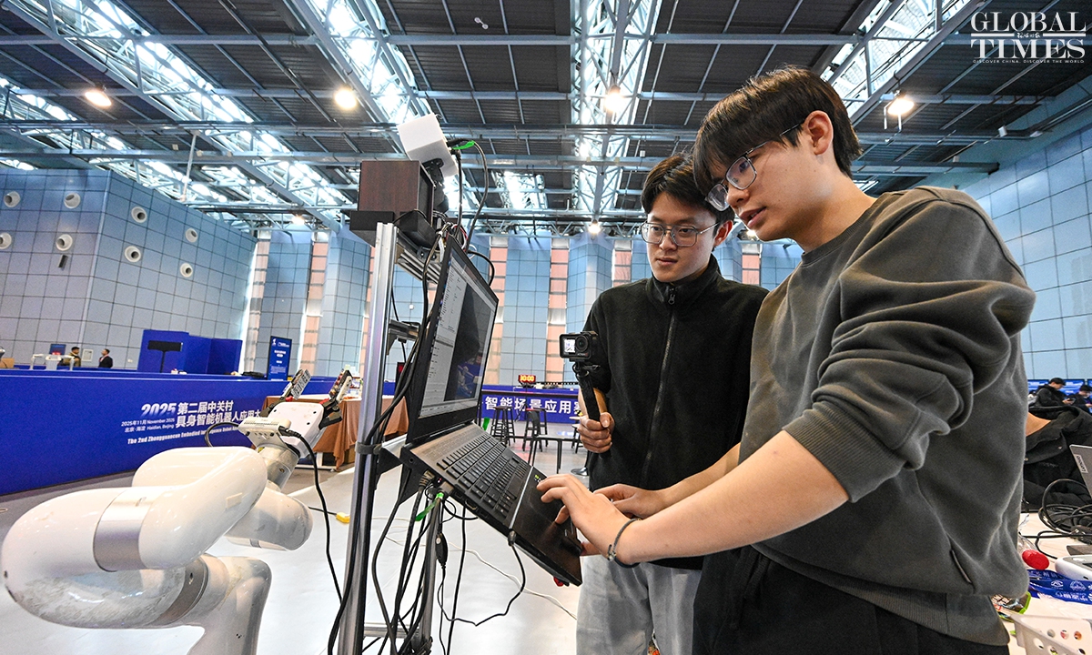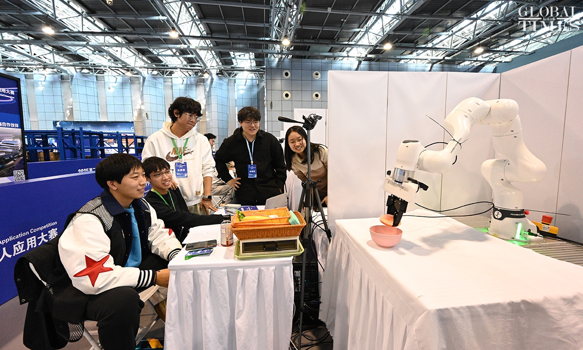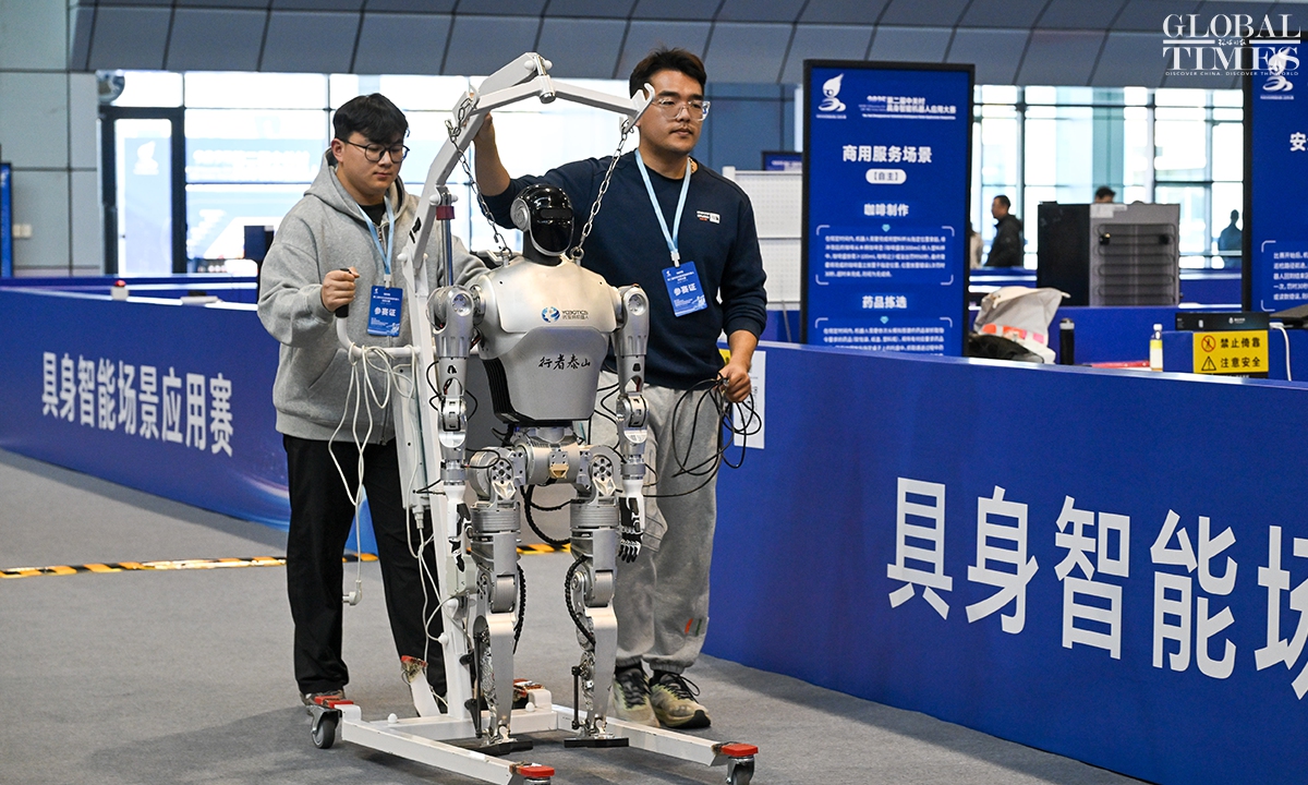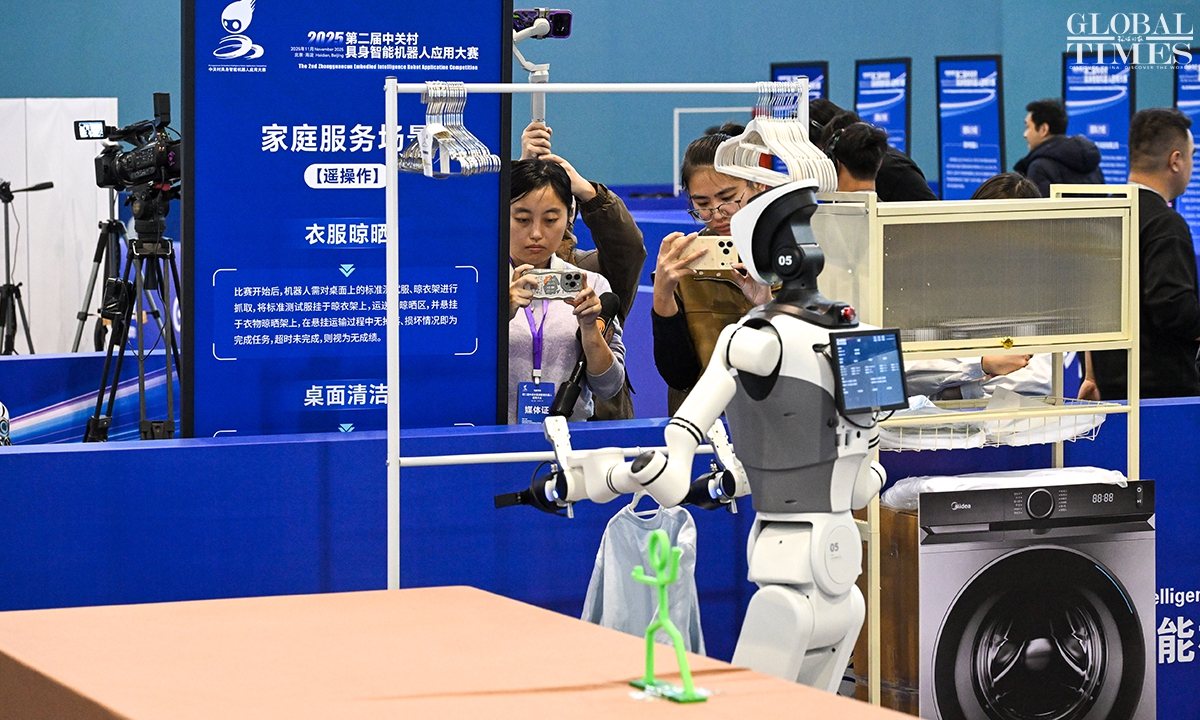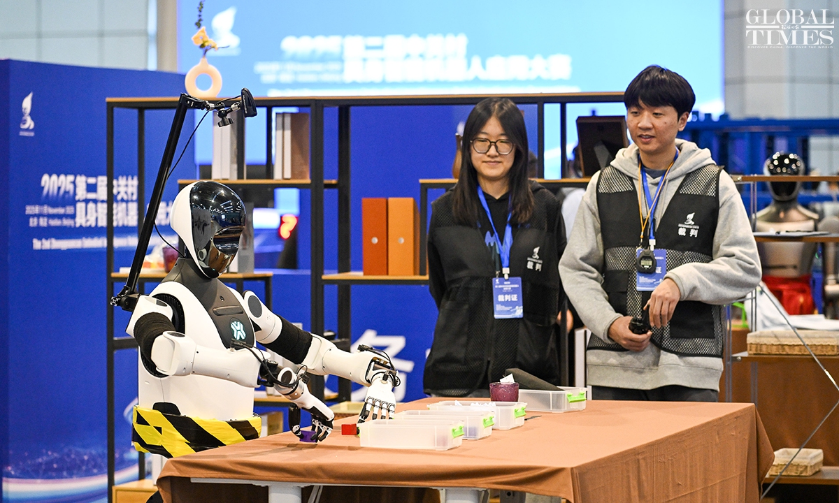 The finals of the 2025 2nd Zhongguancun Embodied Intelligence Robot Application Competition were held on Tuesday at the Zhongguancun Exhibition Center in Beijing. A total of 99 top teams from across China gathered in Zhongguancun to compete in 19 core tasks, vying for a total prize pool of 2 million yuan. The event aims to accelerate the application and development of embodied intelligence technologies in real-world scenarios. Photos: Chen Tao/GT