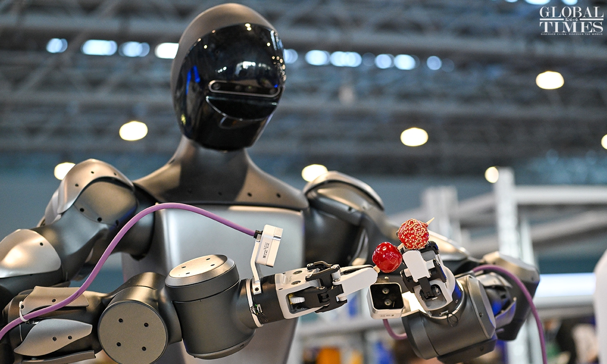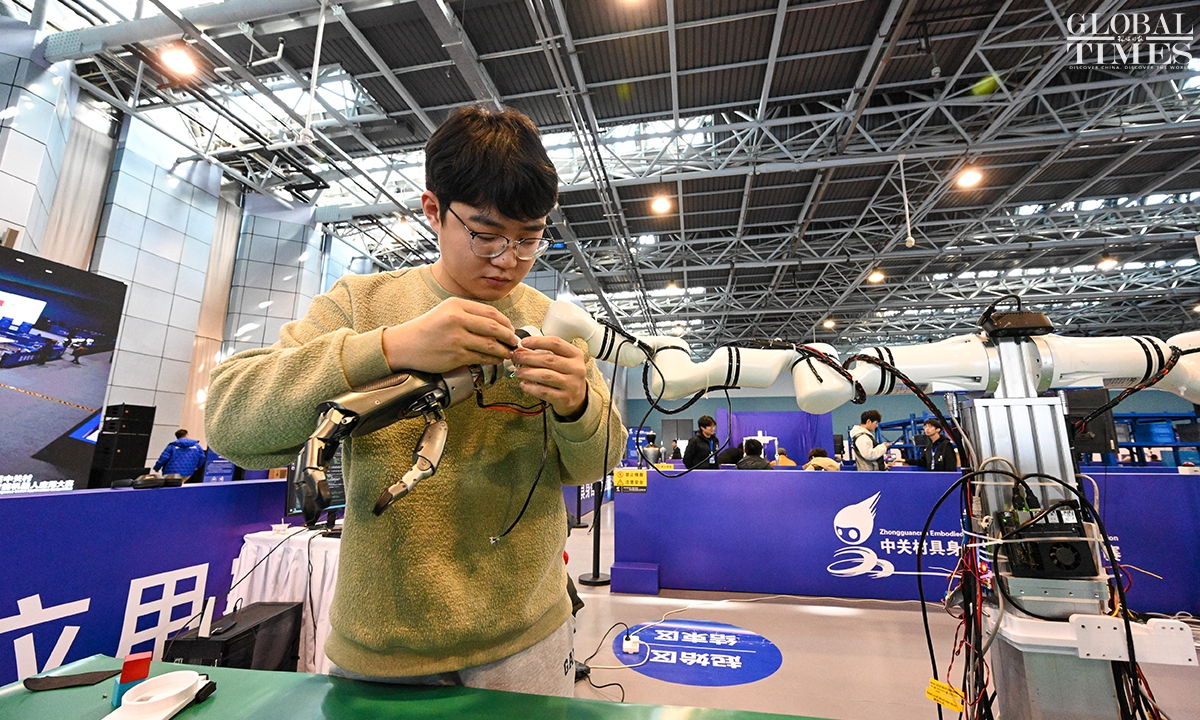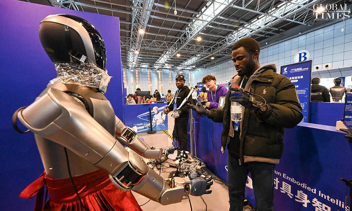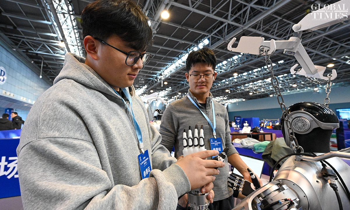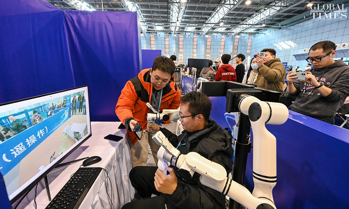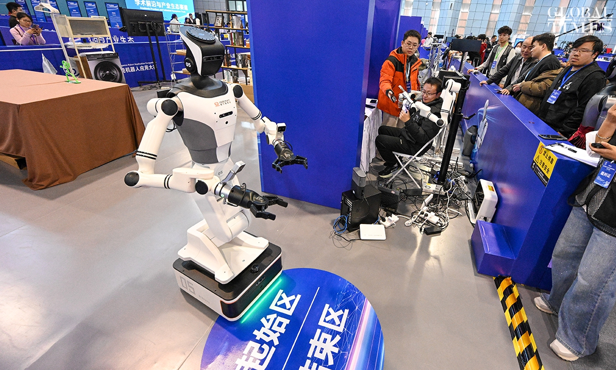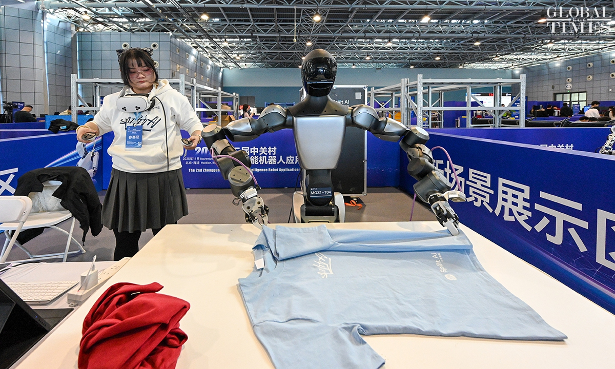 The finals of the 2025 2nd Zhongguancun Embodied Intelligence Robot Application Competition were held on Tuesday at the Zhongguancun Exhibition Center in Beijing. A total of 99 top teams from across China gathered in Zhongguancun to compete in 19 core tasks, vying for a total prize pool of 2 million yuan. The event aims to accelerate the application and development of embodied intelligence technologies in real-world scenarios. Photos: Chen Tao/GT