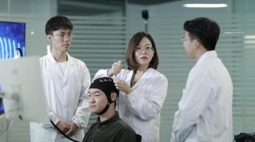 A team of brain-computer interface experts conducts an experiment at Tianjin University. (Photo provided to chinadaily.com.cn)