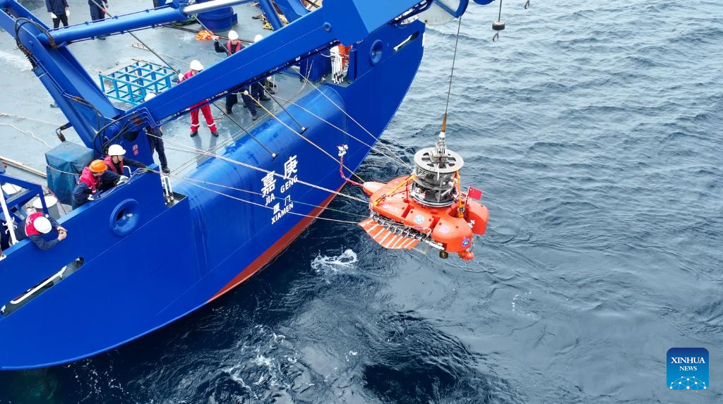 Sea Guru II, an underwater robot designed by researchers at Westlake University in east China's Zhejiang Province, is seen before a 2,000-meter deep-sea trial in the South China Sea, March 4, 2025.(Westlake University/Handout via Xinhua)