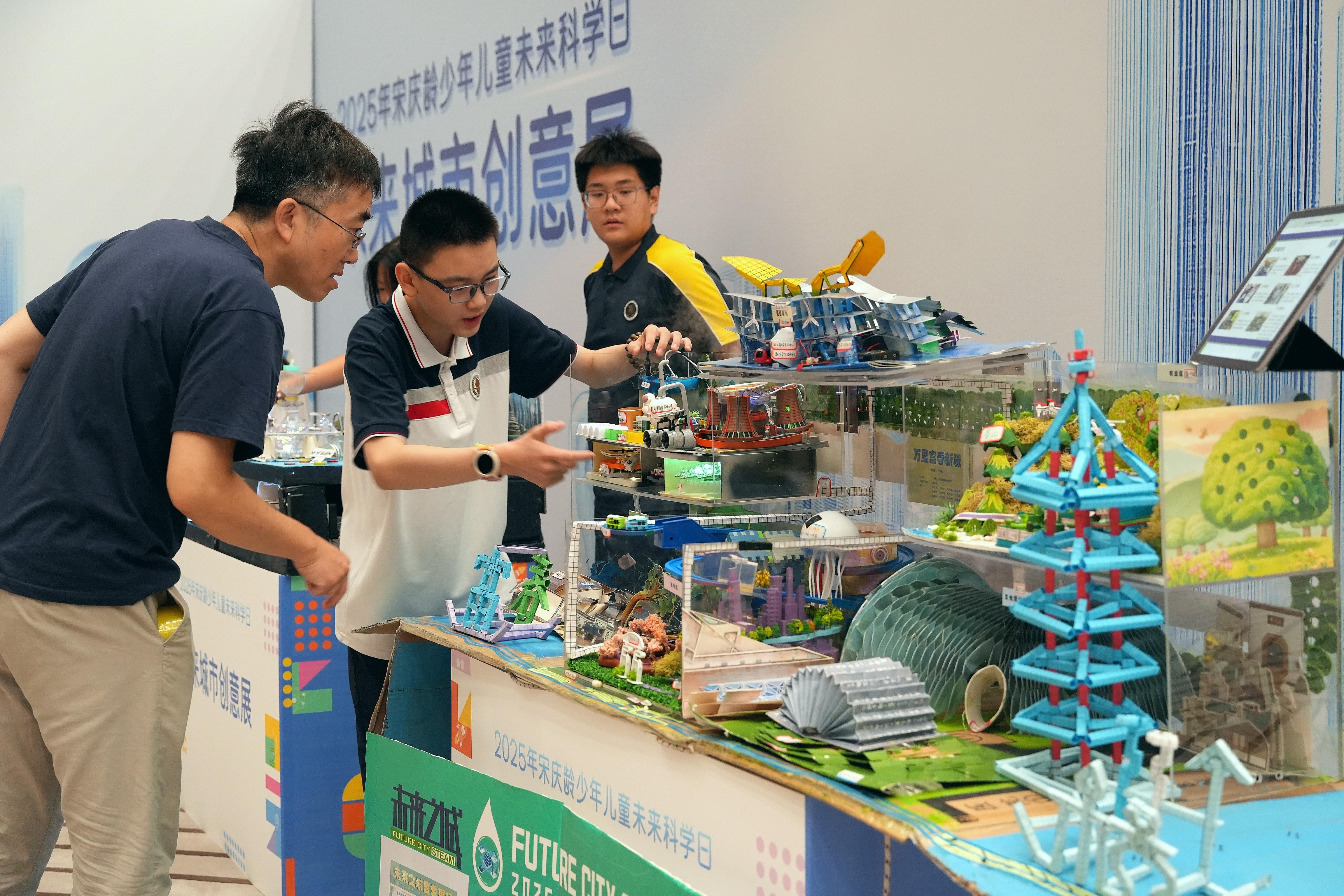 Visitors view creative models at an exhibition themed "Future City." (PHOTO: HONG Xing / Science and Technology Daily)