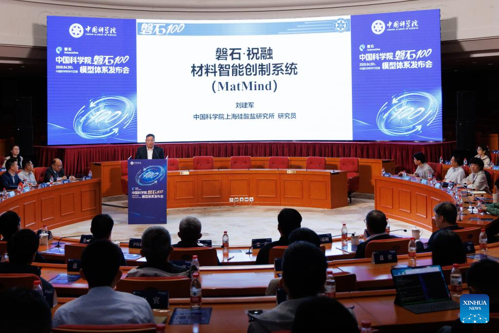 Researcher Liu Jianjun at the Shanghai Institute of Ceramics of the Chinese Academy of Sciences (CAS) reveals an AI model in Beijing, capital of China, April 28, 2026. The Chinese Academy of Sciences (CAS) on Tuesday revealed an artificial intelligence (AI) model system supporting scientific research, empowering multiple scientific domains including mathematics, physics and biology. This marks a transition in AI-driven scientific research from fragmented and isolated exploration toward collaborative, efficient and platform-based innovation.