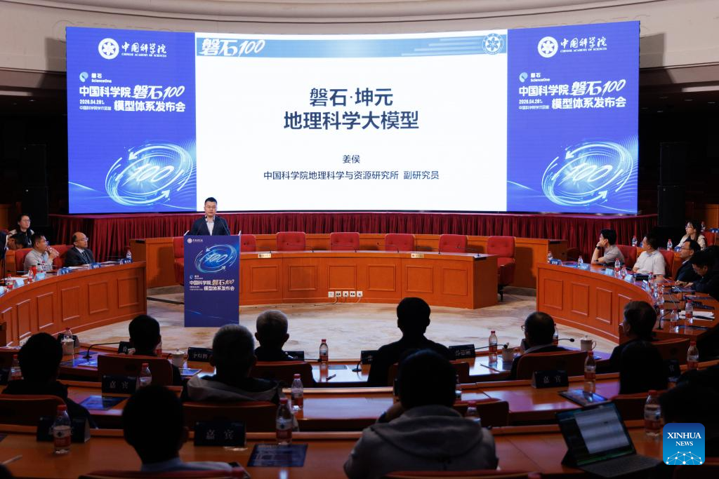 Associate researcher Jiang Hou at the Institute of Geographic Sciences and Natural Resources Research of the Chinese Academy of Sciences (CAS) reveals an AI model in Beijing, capital of China, April 28, 2026. The Chinese Academy of Sciences (CAS) on Tuesday revealed an artificial intelligence (AI) model system supporting scientific research, empowering multiple scientific domains including mathematics, physics and biology. This marks a transition in AI-driven scientific research from fragmented and isolated exploration toward collaborative, efficient and platform-based innovation.