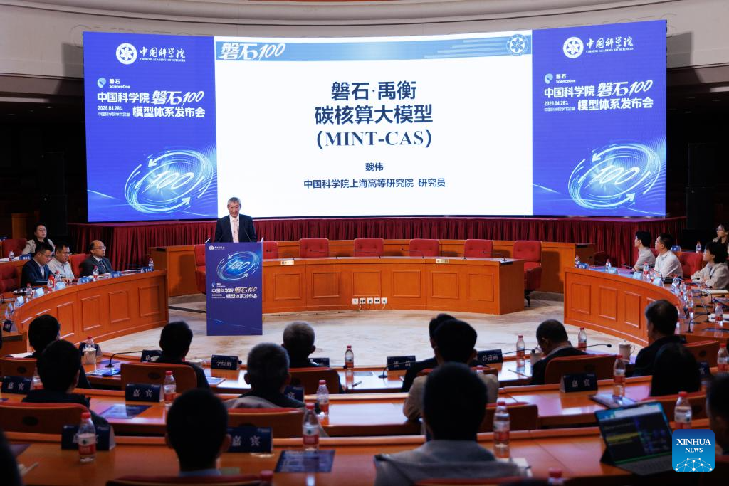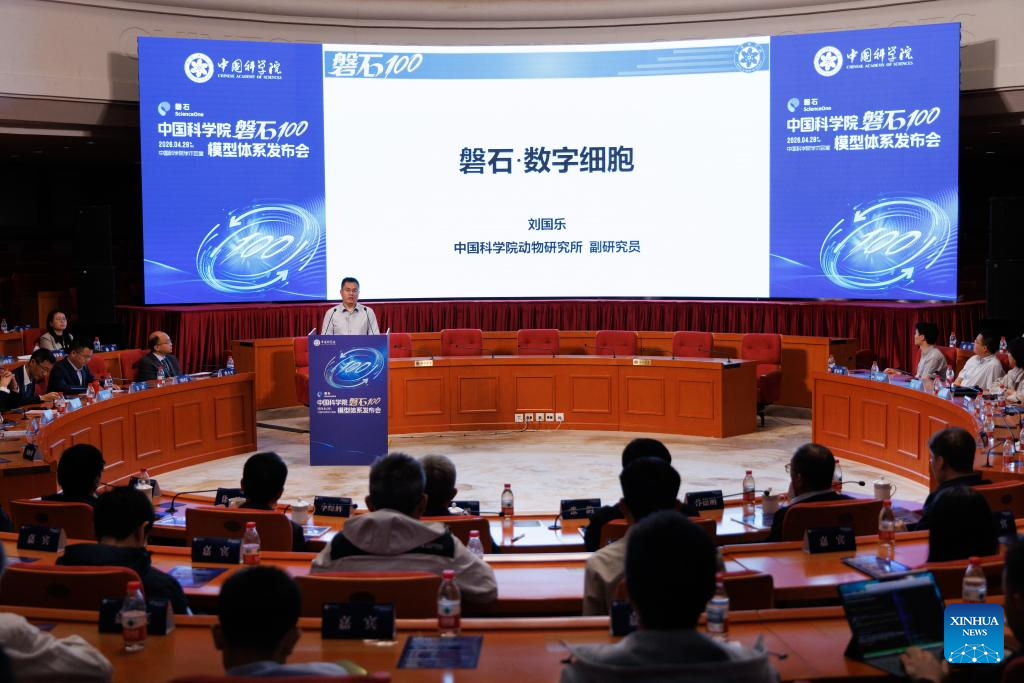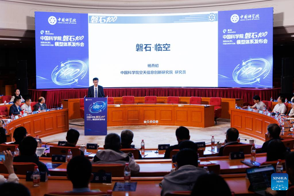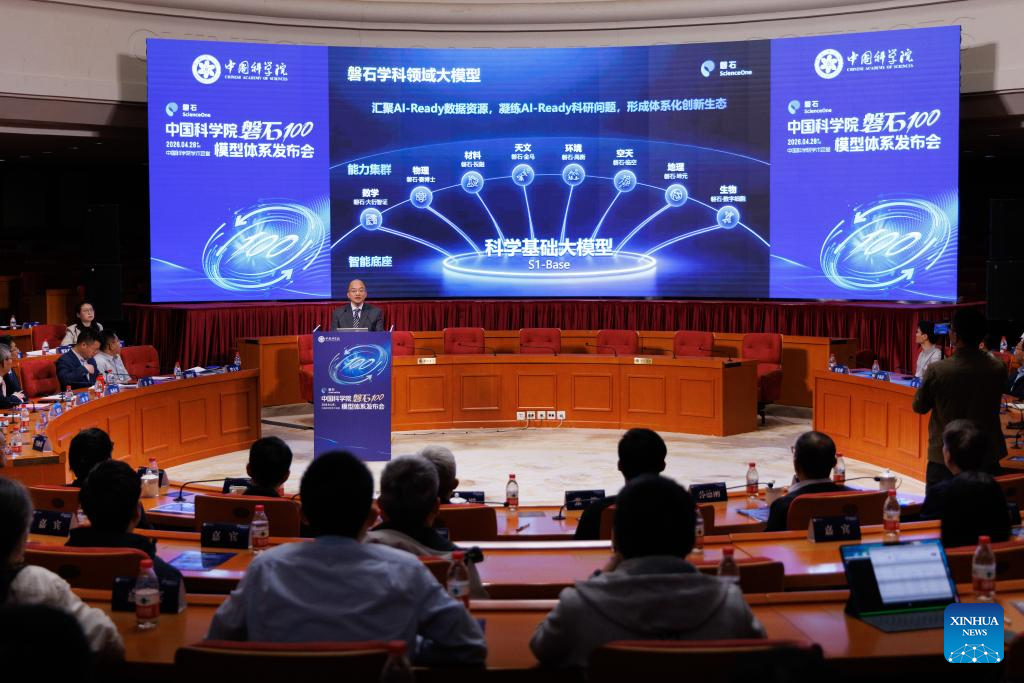 This photo taken on April 28, 2026 shows a scene at the launching ceremony of ScienceOne 100, an artificial intelligence (AI) model system by the Chinese Academy of Sciences, in Beijing, capital of China. The Chinese Academy of Sciences (CAS) on Tuesday revealed an artificial intelligence (AI) model system supporting scientific research, empowering multiple scientific domains including mathematics, physics and biology. This marks a transition in AI-driven scientific research from fragmented and isolated exploration toward collaborative, efficient and platform-based innovation.