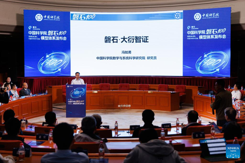 Researcher Feng Ruyong at the Academy of Mathematics and Systems Science of the Chinese Academy of Sciences (CAS) reveals an AI model in Beijing, capital of China, April 28, 2026. The Chinese Academy of Sciences (CAS) on Tuesday revealed an artificial intelligence (AI) model system supporting scientific research, empowering multiple scientific domains including mathematics, physics and biology. This marks a transition in AI-driven scientific research from fragmented and isolated exploration toward collaborative, efficient and platform-based innovation.