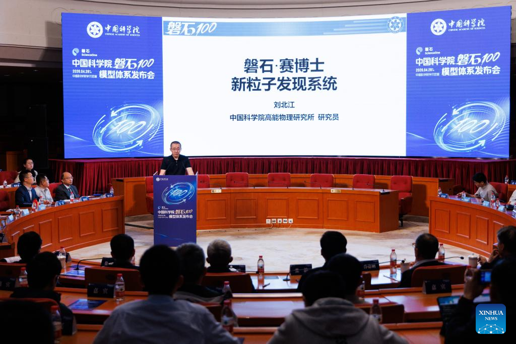Researcher Liu Beijiang at the Institute of High Energy Physics of the Chinese Academy of Sciences (CAS) reveals an AI model in Beijing, capital of China, April 28, 2026. The Chinese Academy of Sciences (CAS) on Tuesday revealed an artificial intelligence (AI) model system supporting scientific research, empowering multiple scientific domains including mathematics, physics and biology. This marks a transition in AI-driven scientific research from fragmented and isolated exploration toward collaborative, efficient and platform-based innovation.