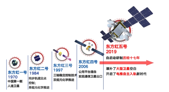 从1970年“东方红”一号上天到20世纪80年代的“东方红”二号,再到2019年的“东方红”五号,“东方红”系列卫星是我们国家航天事业发展历程的见证,代表了一代一代航天人的不懈追求。随着卫星的个头不断变大,它们的承载能力在不断增强,功能性能在不断提高,控制水平也在不断进步。