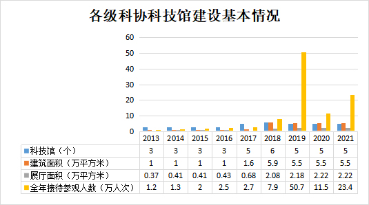 截至2021年底,各级科协拥有所有权或使用权的科技馆[23]5个。总建筑面积55700平方米,展厅面积22168平方米。已实行免费开放的科技馆5个。科技馆全年接待参观人数23.4万人次。流动科技馆4个。科普活动站(中心、室)868个,全年参加活动(培训)人数77.4万人次。科普画廊建筑面积(宣传栏、宣传橱窗)[24]1.2万平方米,全年展示面积4.2万平方米。科普大篷车8辆,全年下乡次数68次。科普大篷车全年下乡行驶里程2.2万公里,受益人数3.2万人次。