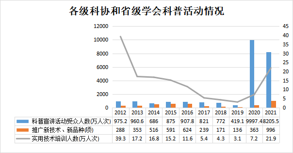 各级科协和省级学会举办科普宣讲活动[25]4454场次,其中专家科普报告会2246场次,专题展览154场次,科技咨询970场次,全国科普日、科普周活动384场次。科普宣讲活动受众人数8205.5万人次,其中全国科普日、科普周活动受众人数1201.1万人次。参加各类科普活动的科技人员2.6万人次,参加各类科普活动的学会、协会、研究会483个次。举办实用技术培训1118次,接受培训人数21.9万人次。推广新技术新品种996项。各类科普活动覆盖村(社区)9520个次。