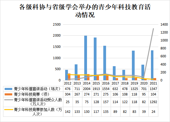 各级科协和省级学会举办青少年科普宣讲活动1347场次,青少年科普宣讲活动受众人数1292.1万人次。举办青少年科技竞赛104项,参加竞赛的青少年24.3万人次,获奖人数2.9万人次。举办青少年科学营[26]2次,参加人数296人次。编印青少年科技教育资料12种,印数3.6万册。举办青少年科技教育活动和培训915场次,参加培训人数21.4万人次。通过中学生英才计划[27]培养学生125人。