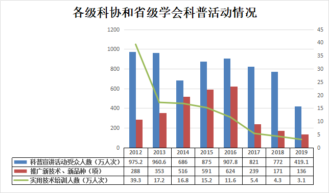 各级科协和省级学会举办科普宣讲活动[25]4050场次,其中专家科普报告会2025场次,专题展览349场次,科技咨询909场次。科普宣讲活动受众人数419.1万人次,属于全国科普日、科普周活动580场次。科普宣讲活动受众人数419万人次,其中属于全国科普日、科普周活动受众人数77万人次。参加各类科普活动的科技人员2.8万人次,。参加各类科普活动的学会、协会、研究会679个次。举办实用技术培训441次,接受培训人数3.1万人次。推广新技术新品种136项。各类科普活动覆盖村(社区)3973个次。