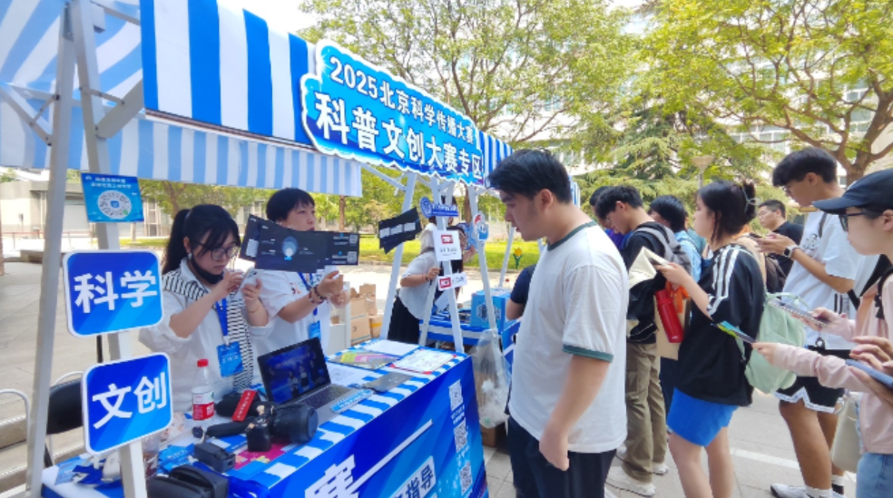 这是2025北京科学传播大赛——科普文创大赛的首场线下文创市集,在现场特别设立了“大赛报名专区”,吸引了众多师生驻足咨询,点燃了大家的参赛热情。现场市集不仅有效促进了赛事的推广与普及,更为广大科普文创爱好者提供了一个推介自我、交流学习的展示平台。