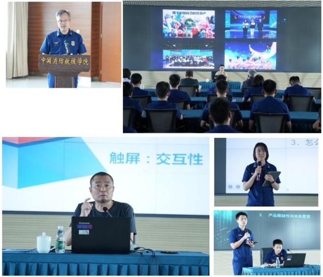 北京航空航天大学新媒体艺术与设计学院信息艺术设计系主任王可老师,以《从创意到表现——消防文创与科普海报探究》为题,为师生们带来了一场精彩纷呈的专题报告。结合国内外成熟的文创作品案例,从“消防文创设计”与“消防海报设计”两个维度进行了深入剖析,为师生们打开了艺术创作的新视野,激发了大家的创作灵感,赢得了现场师生的阵阵掌声。在互动环节,学生们纷纷展示了自己创作的文创作品,并就创作过程中遇到的问题与专家进行了深入的交流与讨论。