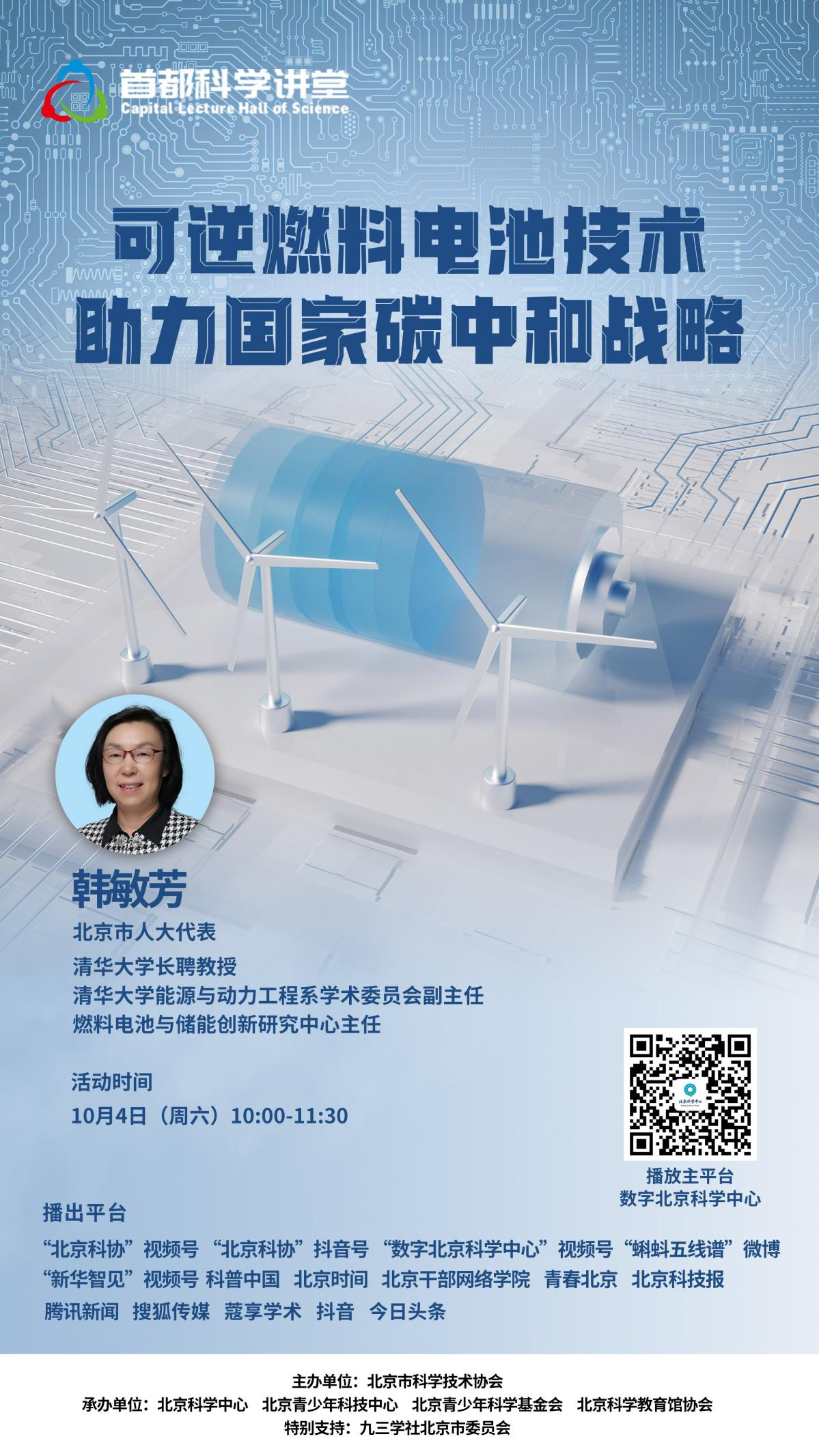白天发电,夜晚储能——这种既能供电又能蓄能的“电化学魔法装置”,正是被誉为能源界“变形金刚”的可逆燃料电池。其中,可逆固体氧化物燃料电池(Solid Oxide Fuel Cell,简称SOFC)尤为特别:它结构坚固、运行依托高温反应、输出稳定,适配多种燃料,发电效率极高。更重要的是,它具备“可逆”特性,不仅能发电,还能在需要时反向工作实现储能,堪称未来清洁能源系统中的“明星选手”。 本期首都科学讲堂特别邀请北京市人大代表、清华大学长聘教授、清华大学能源与动力工程系学术委员会副主任、燃料电池与储能创新研究中心主任韩敏芳,为公众深入解读这项融合材料科学与能源工程的前沿技术,带大家了解SOFC如何在推动国家“双碳”战略中发挥关键科技作用,为构建绿色低碳的未来能源体系注入强劲动能。