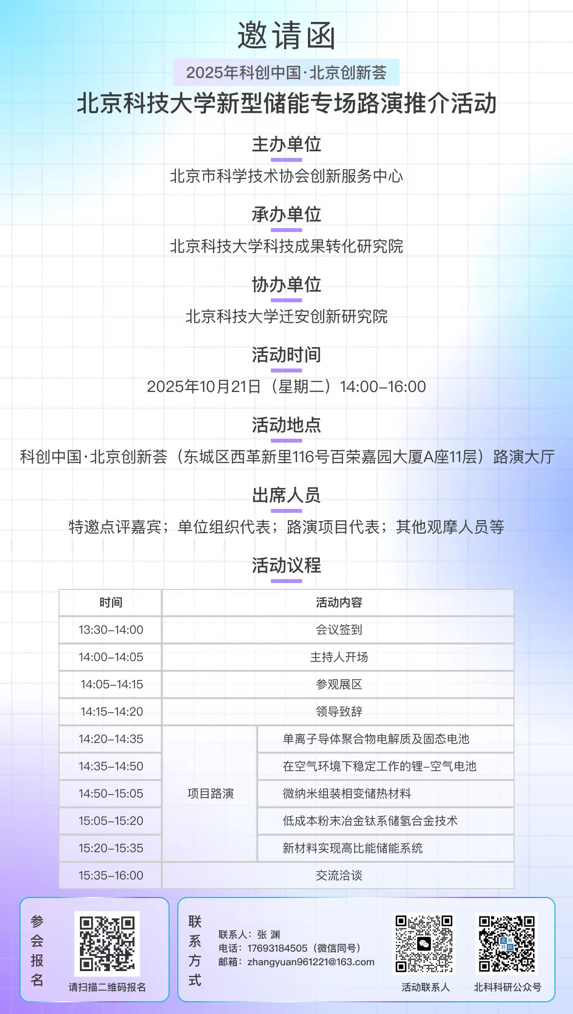 活动预告 | 科创中国 · 北京创新荟路演推介活动——北京科技大学新型储能专场