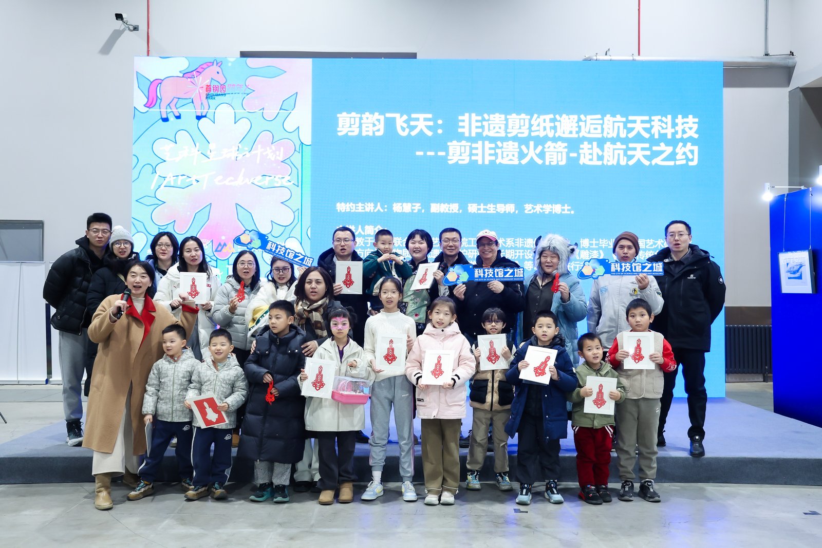 值得一提的是,“艺科星球计划”深度嵌入首钢园跨年系列活动,依托“苍穹艺境・寰宇创想”科普示范工程的资源整合能力,构建起覆盖多元群体的公共科普文化空间。活动期间,“多彩中国”高校原创动漫展、“生命之光-漫秀场”世博会AI青少年艺术展映、AI短片展映、AIGC影像创作亲子工作坊、首届“星海邀约”高校科幻作品征集颁奖典礼等活动接连举办。同时,中国航天科技集团一院航天科普专家钱航博士带来的航天主题科普讲座,北京联合大学艺术学院工艺美术系非遗保护专业杨慧子副教授主持的非遗手作体验活动,让非遗剪纸、绢花、通草工艺等传统技艺与航天主题、人工智能、科幻叙事深度融合,成为传统文化创造性转化、创新性发展与航空航天科普有机结合的生动注脚。一位现场观众在体验非遗剪纸与航天主题结合的活动后感慨:“这是我在石景山体验过最有深度的非遗与科普结合活动之一。它让我们从地方民俗走向世界文化,从传统技艺走向当代表达,更让航天科技变得亲切可感。”