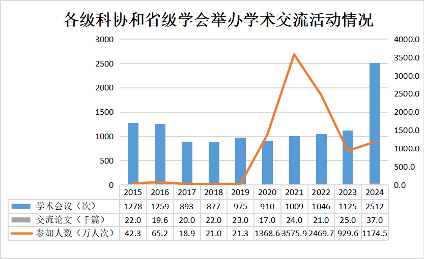 各级科协和省级学会共举办学术会议2,512场次,参会1174.5万人次,986.6万人次线上参看,交流论文3.7万篇。