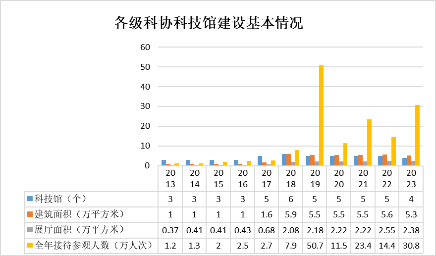 截至2023年底,各级科协拥有所有权或使用权的实体科技馆[29]4个,总建筑面积5.3万平方米,展教面积2.4万平方米,科技馆全年服务公众30.8万人次。流动科技馆1个。科普大篷车5辆,全年举办活动119场。科普大篷车全年下乡行驶里程1.7万公里,服务公众2.5万人次。