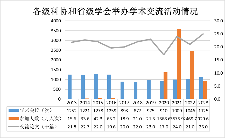 各级科协和省级学会共举办学术会议1,125场次,参会929.6万人次,线上参看460.8万人次,交流论文2.5万篇。