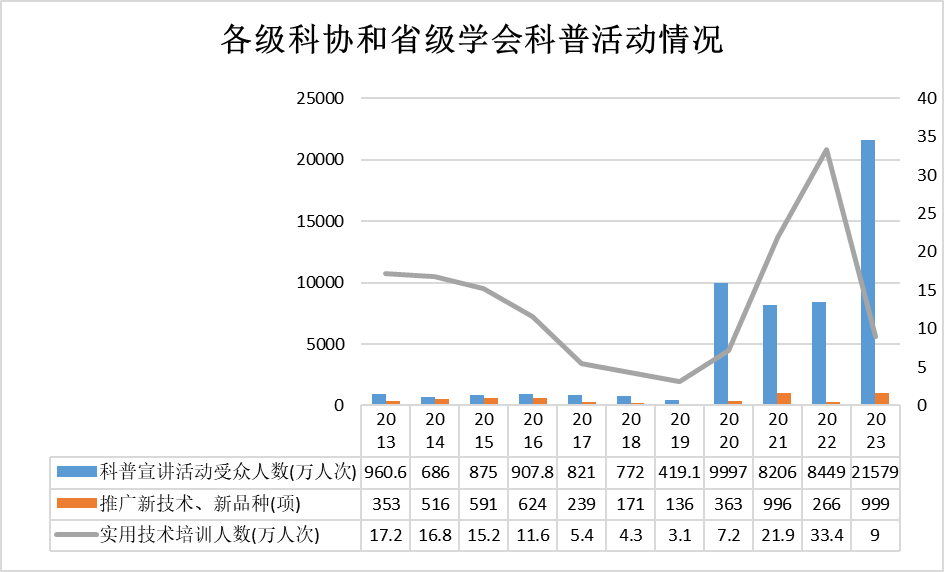 各级科协和省级学会举办科普宣讲活动[30]6,717次,其中专家科普报告会、讲座3,669次,专题展览471次。全国科普日活动871次。科普宣讲活动受众人数2.2亿人。举办实用技术培训999次,接受培训9.0万人次。