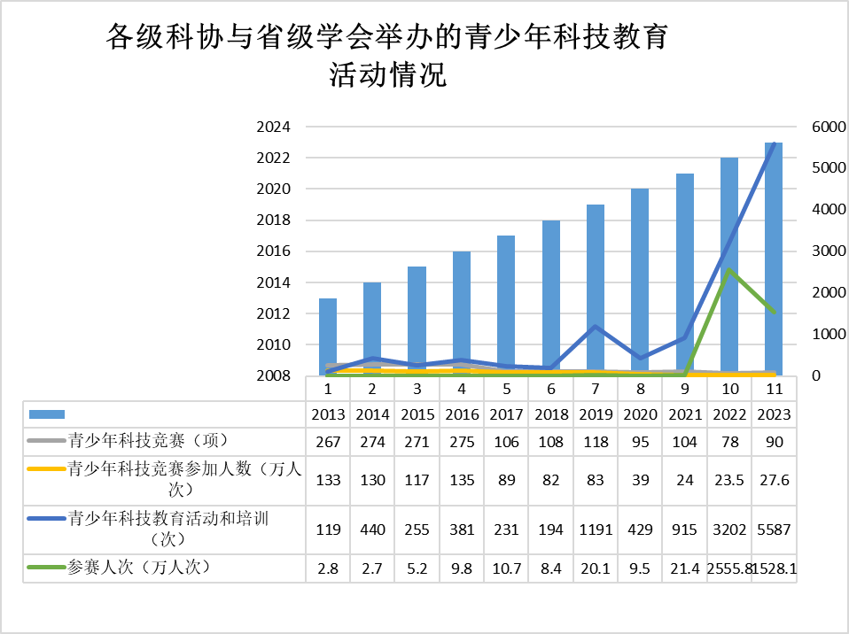 举办青少年科技竞赛90次,参加竞赛的青少年27.6万人次。举办青少年高校科学营[31]4次,参加营员人数2,474人。举办青少年科技教育活动和培训[32]5,587次,参与人员1,528.1万人次。举办港澳台地区青少年科技人文交流活动4场,参与人员6,437人次。